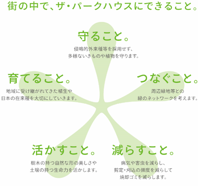 本取り組みは2015年の開始以来、規模や敷地面積を問わず、ザ・パークハウスをはじめ、ザ・パークワンズ、ザ・パークハビオ、ザ・パークハウス ステージに導入しており、今年で10周年を迎えました。都市のなかで自然の循環を取り戻しながら、暮らしの快適性向上にも資する取り組みとして、着実に実践を重ねています。
