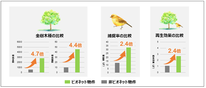 「ビオ ネット イニシアチブ」では、取り組みの実効性を客観的に確認するため、(株)シンク・ネイチャーの生物多様性ビッグデータ分析を活用し、導入物件と非導入物件の比較検証を行っています。
