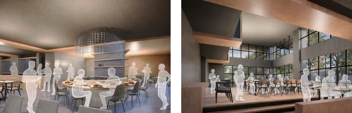 本物件では、吹き抜けの食堂ラウンジで開放感のある空間を作り出します。館内ではビュッフェスタイルの食事提供により賑わいを創出し、設けられたアッパーラウンジでは学生同士が自然に集まり、コミュニケーションを促進します。