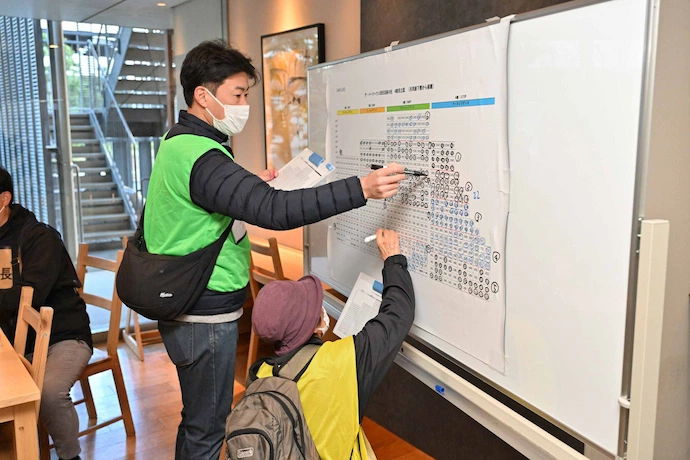 各マンションでは、マンション独自の防災ルールを定めた「防災計画書」に従い、安否確認フローを確認。安否確認シートを各住戸ごとの扉に貼り出し、担当者が各住戸の安否確認情報を収集。その情報を災害対策本部に持ち帰り、マンション全体の状況を把握しました。ザ・パークハウス 津田沼奏の杜では、有事の際に活躍が期待されるキッズ防災メンバーによる館内アナウンスも実施しました。