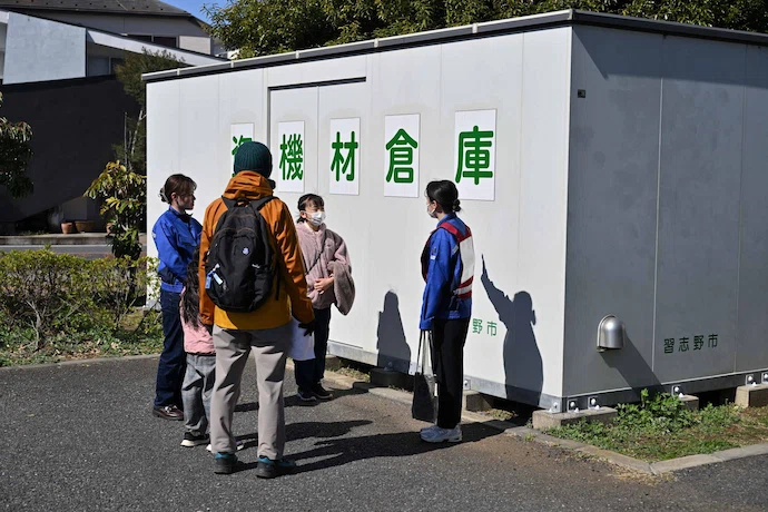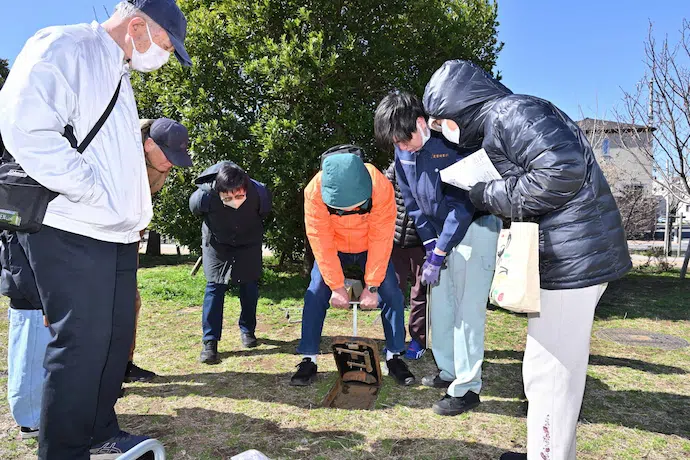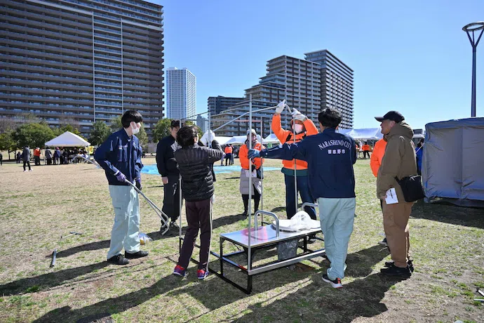 谷津奏の杜公園には54カ所に災害用マンホールトイレが設置されており、地域の防災倉庫に備えている「災害用マンホールトイレ」を実際に組み立てる訓練を行いました。