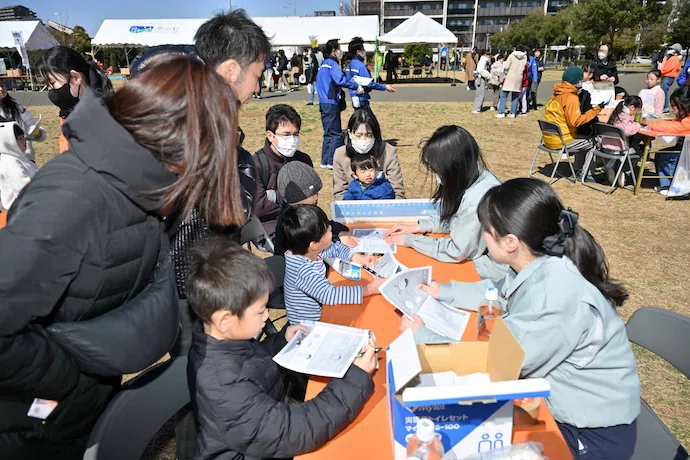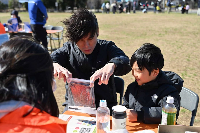 家族に必要な備えを考える、オリジナルの防災ツール「そなえるドリル新規ウィンドウを開きます」を使ったワークショップ。自宅の家具転倒リスクを見直し、対策を考える内容や、家族全員に必要な簡易トイレ(凝固剤)の個数を考え、凝固剤の使用体験なども行いました。