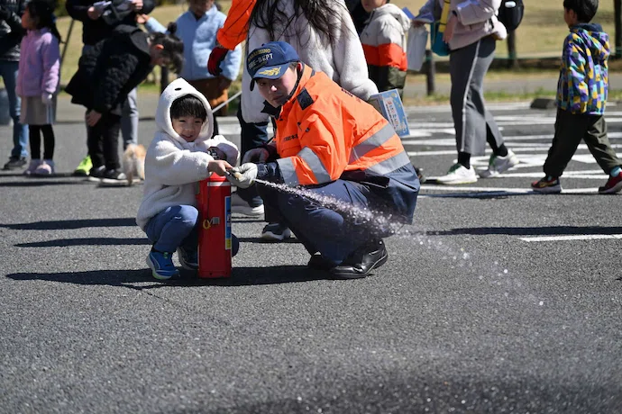 消火器による初期消火訓練で使用方法を学びました。