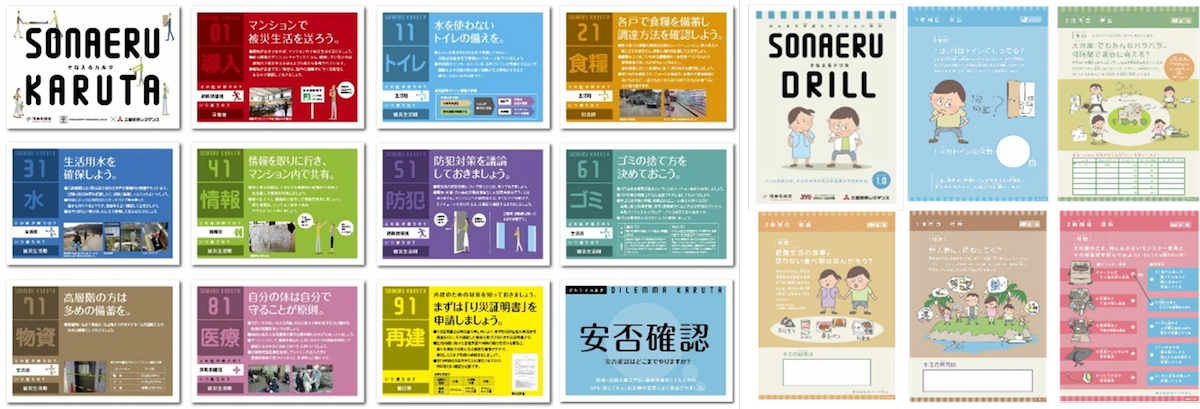 東日本大震災・熊本地震等の生の声を届けるために、実際に困ったことを「トイレ」・「食糧」・「情報」といった切り口で伝える防災ツール「そなえるカルタ」。