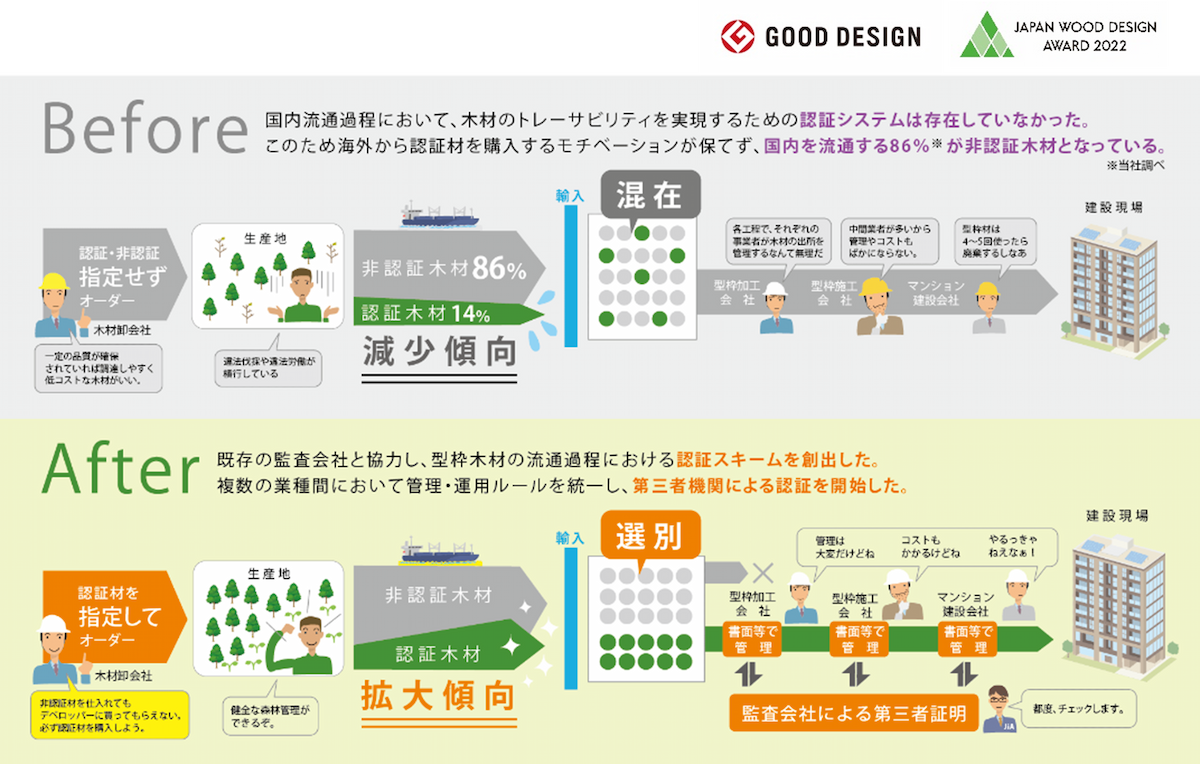 現在、森林から商社までの流通段階においては、FM認証やCoC認証によって認証を繋ぐ体制が整っています。しかし、以降の型枠工務店による加工から建設現場での施工に至る工程では、商慣習上認証の取得が定着しておらず、追跡が途切れ未認証経路となるという実態があります。