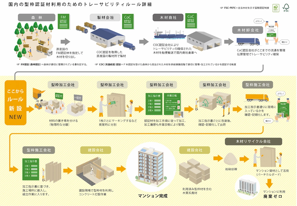 新築建築物において、持続可能性に配慮した木材の調達基準※2にある型枠用コンクリートパネル※3を採用し、トレーサビリティ(trace(追跡)+ability(能力)=その木材がどこでどうやって作られたのかを追跡できる)の確保を図る目的で各種認証制度が設けられています。一連の履歴を追跡するためには、伐採から供給に至る各流通段階において、個別の事業者が認証を取得している必要があります。