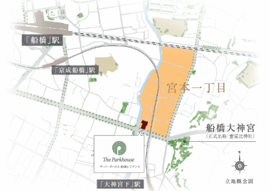 JR総武本線「船橋」駅から徒歩10分、京成本線「京成船橋」駅から徒歩9分、京成本線「大神宮下」駅から徒歩6分と2路線3駅が利用できる利便性の高い立地にありながら、周辺には由緒ある船橋大神宮の豊かな緑が広がります。駅周辺の賑わいと、杜の落ち着きがバランスよく共存する宮本一丁目エリアに位置し、日々の暮らしにおいてアクセスの良さと環境の静けさの双方を享受できる住まいを実現しています。
