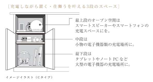 住戸内で増え続ける電子機器の「充電場所問題」を解決するために開発された、キッチンカウンター下の充電ステーションです。複数のアイテムを集約、定位置が決まることで暮らしやすさも高まります。