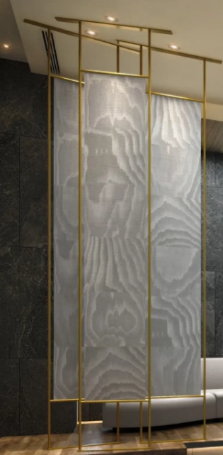 かつて船橋の港を賑わした船の「帆」からインスピレーションを得て、「布」という素材にこだわり、廃盤などによる在庫で使われなかった布素材を美しくアップサイクルする「NUNOUS」を採用。独自製法が生む大理石のように上品な表情のファブリックを、一点物のタペストリーやアートに仕立てています。本物件ではグレー系の未使用のカーテン生地をセレクト。何千枚ものカーテン生地を圧縮してブロックを形成。スライス面ごとに生まれる唯一の表情を美しくつないだタペストリーが空間を彩ります。