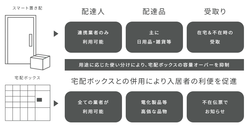 - オートロック付きマンションに専用のスマートロックを後付けし、認証された配達員のみがエントランスを解錠して、マンション内の指定された場所(玄関前など)に荷物を置くことができる「スマート置き配」サービスを採用。