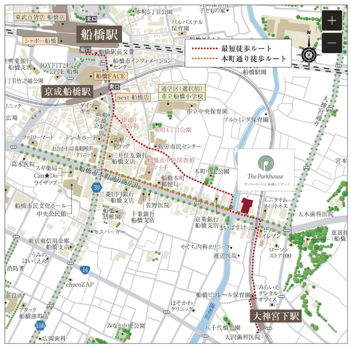本物件は、JR総武本線「船橋」駅、京成本線「京成船橋」駅・「大神宮下」駅の2路線3駅が徒歩10分圏内。船橋大神宮(意富比神社)の豊かな緑が広がる落ち着いたエリアに位置しており、高い利便性と穏やかな生活環境が両立しています。