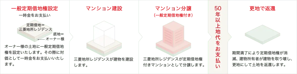 定期借地権とは、借地期間の更新がない借地権の総称です。オーナー様から貸与いただく土地に、マンションなどを建設。契約期間の満了時には更地に戻して返還されるため、オーナー様は土地を手放すことなく、契約期間中の安定した地代収入を得ることができます。