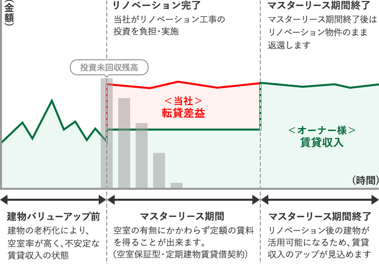 - ※上図は三菱地所レジデンスがオーナーから建物を賃貸する事業をイメージしたものですが、この他に土地建物を取得するケースのReビル事業も行っております。