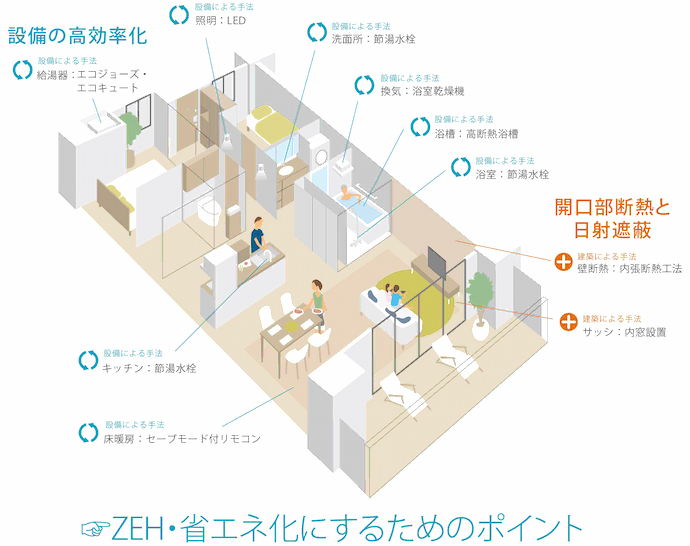 「共用部に触れなくとも、できることが数多くありました。大きく分けて、設備の高効率化と、開口部の断熱性能を上げることです。これらにより、中古マンションのリノベーションでも、ZEH水準・省エネ基準を達成することができました。