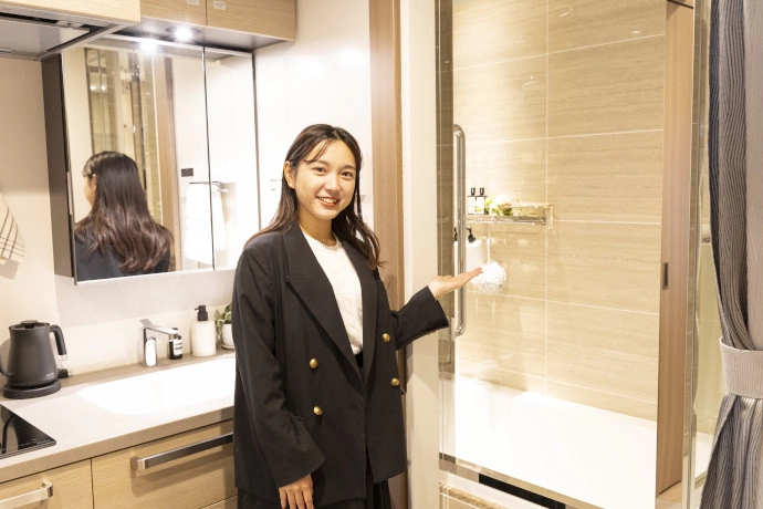 「専有面積が狭いワンルームでは、水回りのスペースが間取りの約半分を占めてしまいます。そのため、似通ったプランばかりになってしまい、入居者様にとっての“間取りを選ぶ楽しみ”が少ないのではないかと考えていました。ザ・パークハビオにお住まいになる方は20〜40代の方も多いことから、友人や社内関係者にヒアリングをしてヒントを得ることもあります。私が開発を担当した「ザ・パークハビオ日本橋三越前」では、毎日ではないけれど疲れて帰宅した日にバスタブを利用したいというご要望に応え、バスタブと洗い場を兼用したホテルライク仕様の「Roomot BathMor(ルーモット バスモル)」を採用した部屋を作りました。水回りスペースを効率良く配置し、入居者様の趣味やこだわりに合わせて自由に使っていただける居室空間を広げられました」と垣内。