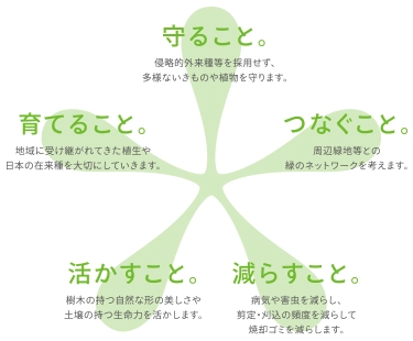 また、侵略的外来種を採用せず、地域に受け継がれてきた植生や日本の在来種を大切にすることで、多様な生きものや植物を守り、育てます。